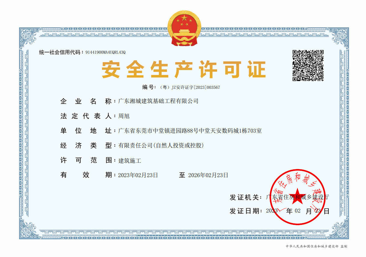 廣東湘城建筑基礎工程有限公司,成立于2016年,注冊資金4888萬元,持有地基基礎工程專業(yè)承包壹級資質,具有安全生產許可證??沙薪痈鞣N基礎類施工,包括各類樁基礎、基坑支護、邊坡支護、地基強夯處理等施工業(yè)務。公司為地基與基礎工程專業(yè)承包、工程施工、技術咨詢、技術開發(fā)、技術服務、信息咨詢實體型企業(yè)。